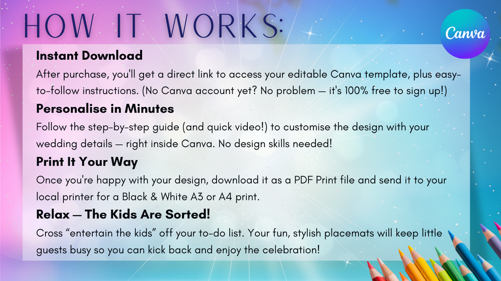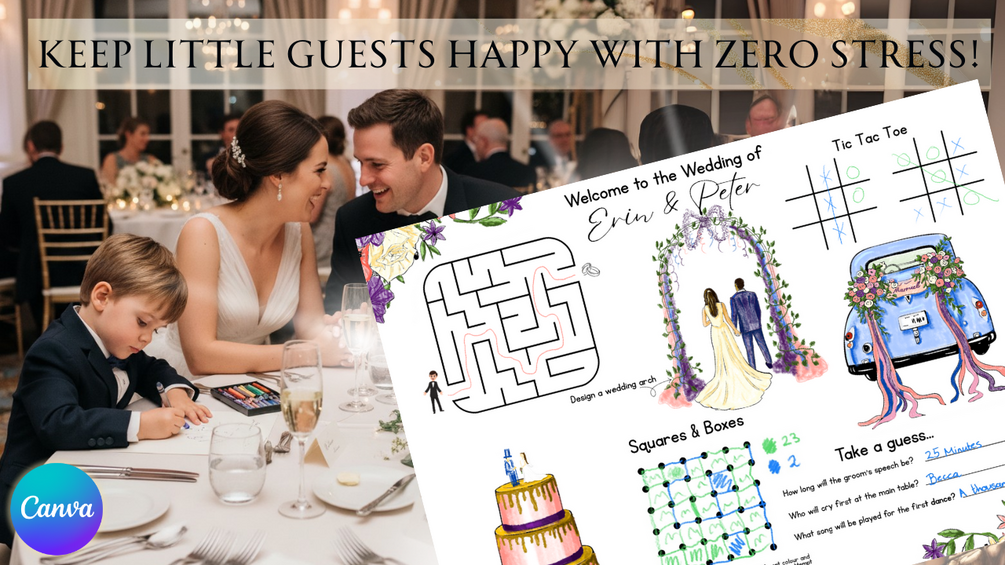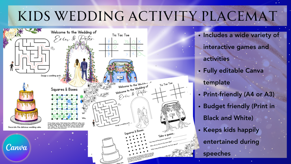 A Canva Template Digital Download for a Kids Wedding Placemat, Printing guidance and Tips and tricks for presentation