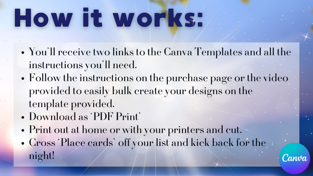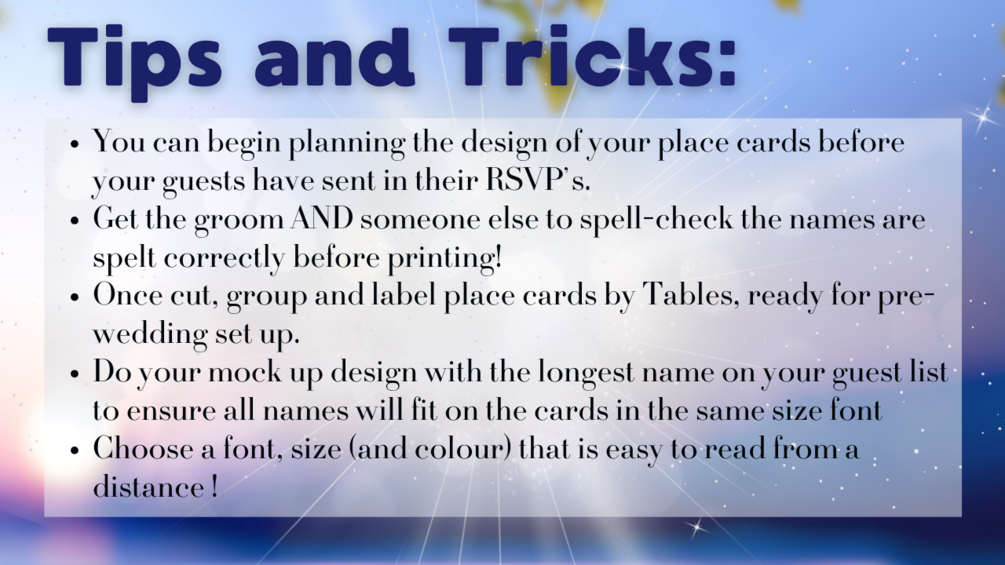 All you need to do is create your design into the template, bulk create the cards using your guest list this A4 sheet and it's ready to print cut and set out on your beautiful tables!